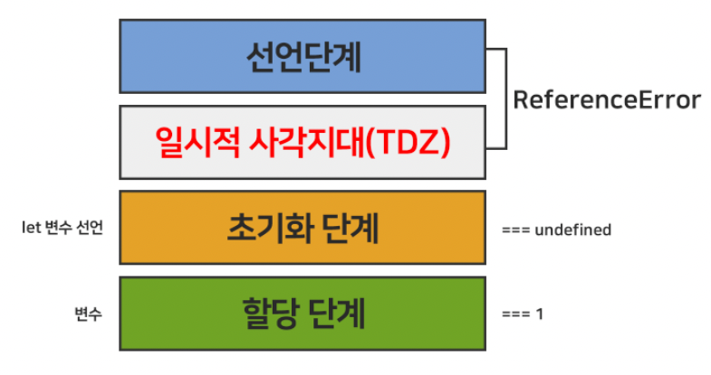 - 변수 호이스팅이 발생하지 않는 것처럼 동작 // 레퍼런스 에러 발생
