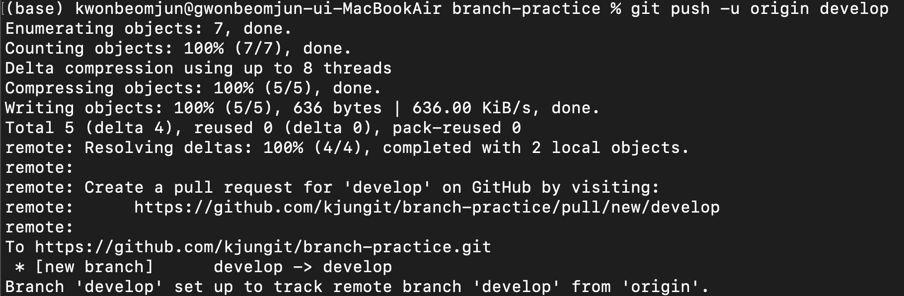 - 명령어가 실행되면 develop 브렌치로 체크아웃 한 후 feature 브랜치의 변경된 내용을 자동으로 develop에 merge한다.