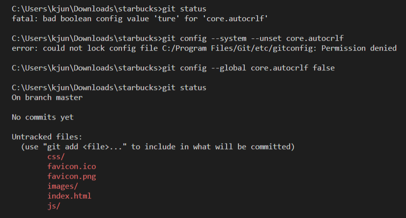 git status 오류해결 fatal: bad boolean config value 'ture' for 'core.autocrlf' 본문