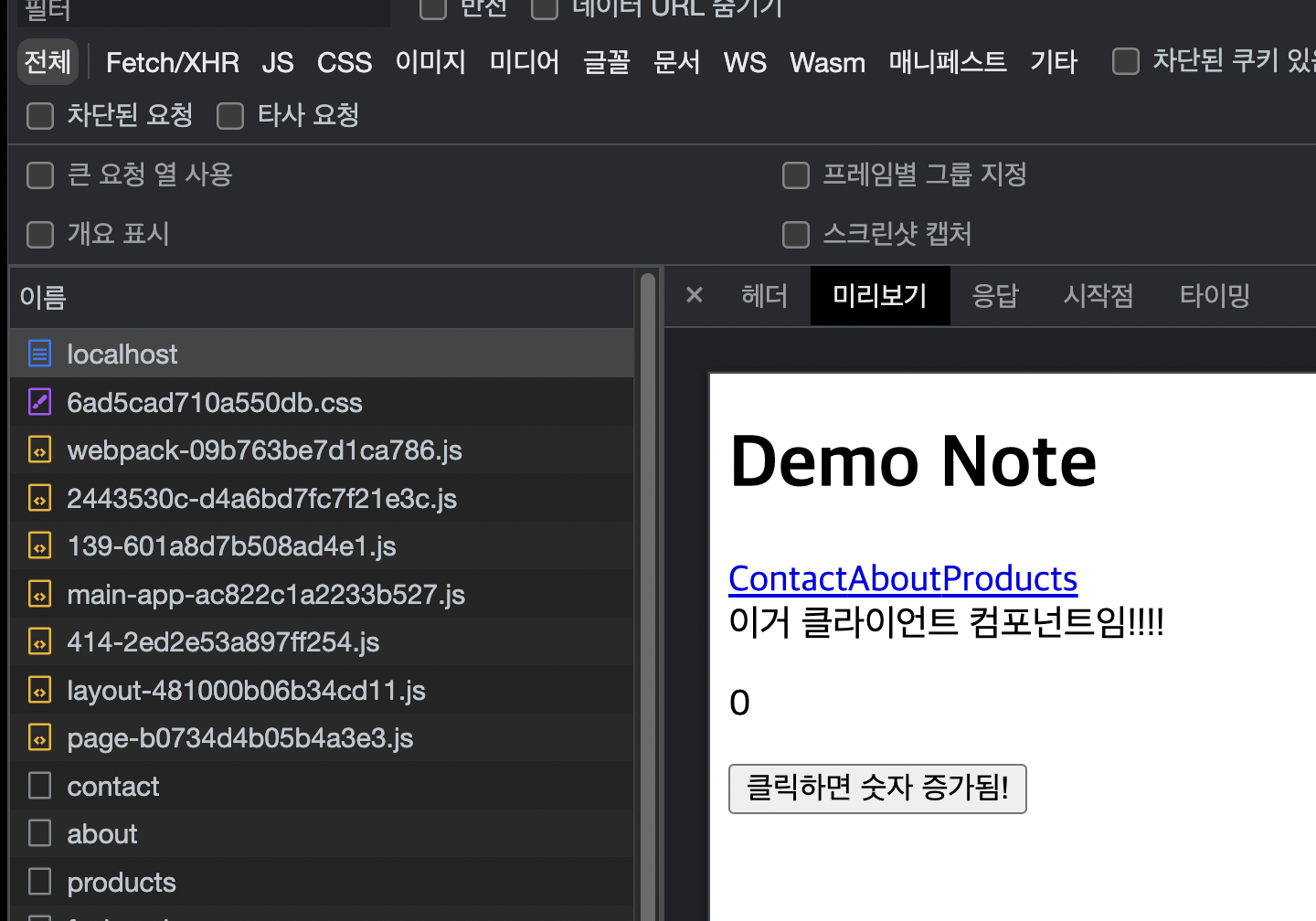 - 그리고 build한 프로젝트를 실행시켜보면 클라이언트 컴포넌트도 서버 렌더링을한 HTML파일에 나타나고 있는걸 볼 수 있다.