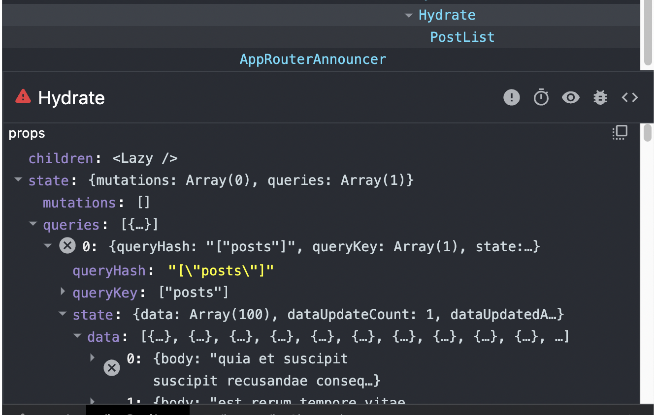 - 서버에서 직렬화된 상태를 전달받은 클라이언트에서 Hydrate 컴포넌트를 사용하여 해당 상태를 역직렬화하고 리액트쿼리의 queryClient를 초기화한다. 이를 통해서 클라이언트는 서버에서 초기 데이터를 사용할 수 있다.