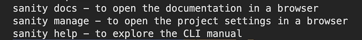 설치를 하면 이렇게 sanity의 doscs, manage, help 명령어를 사용할 수 있으니 알아두자!