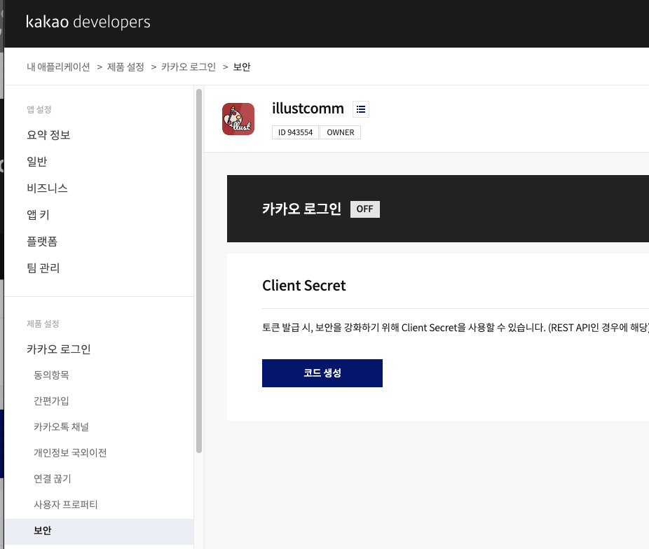 - 내 애플리케이션 > 제품설정 > 카카오로그인 > 보안 에서 Client Secret 토큰을 생성하고 저장한다.