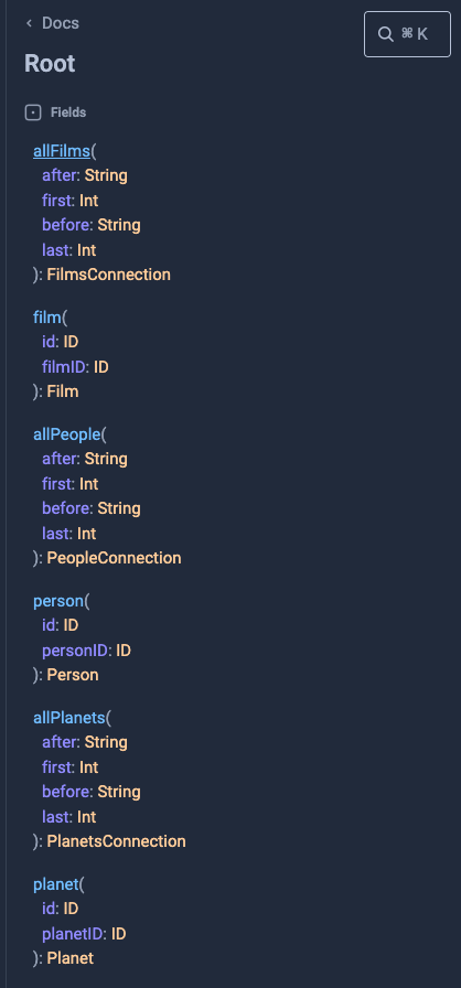 그에 대한 명시도 Docs -> query: Root를 보게 되면 Schema가 작성되어있는걸 볼 수 있다.