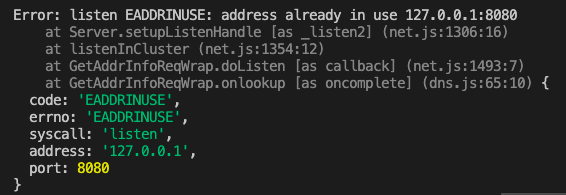 Error: listen EADDRINUSE: address already in use 127.0.0.1:8080