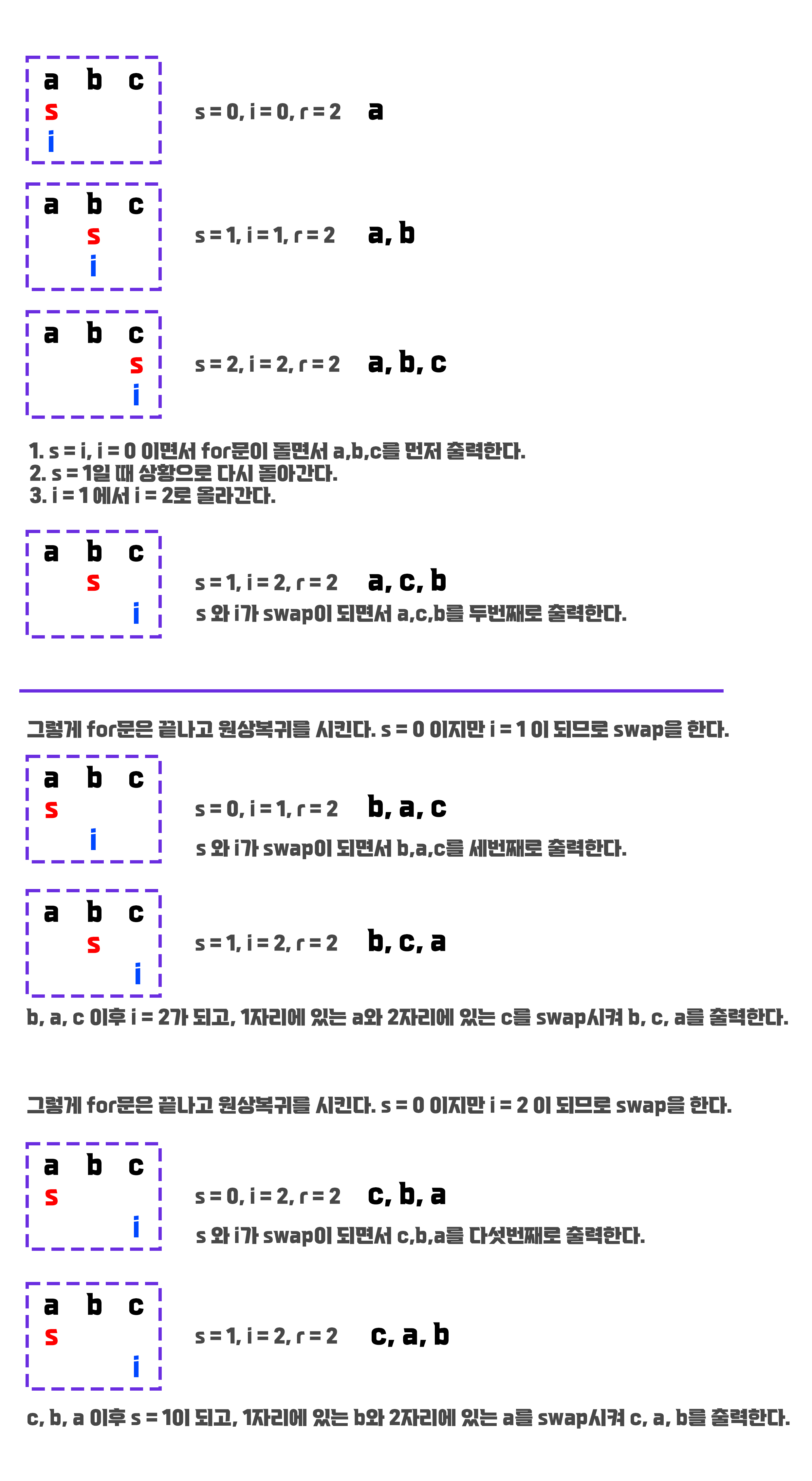 - s가 a자리 일때 i는 증가하면서 b와 c를 바라보고 그 값들을 스왑하면서 겹치지 않는 경우의 수들을 받을 수 있게 된다.