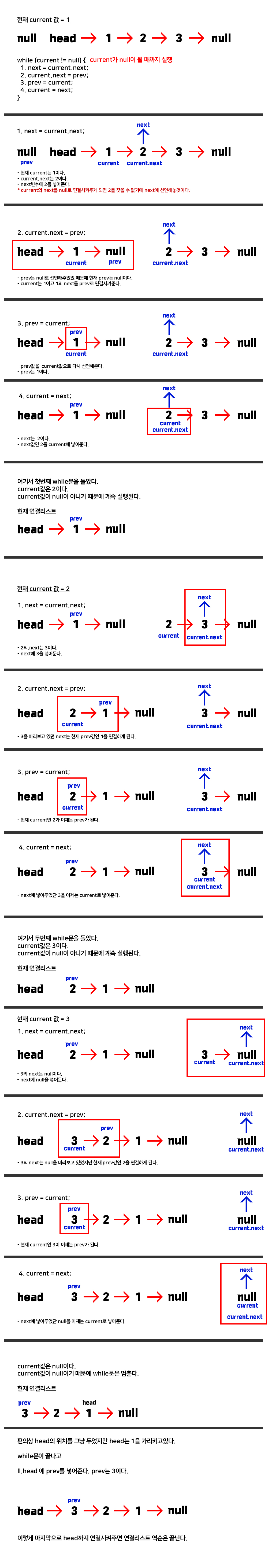 - 이제 current는 2이다. current.next는 3을 바라보고 있다. 3을 next에 넣어준다.