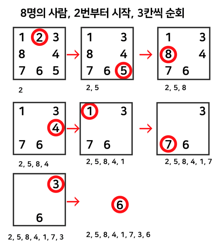 - 1, 2, 3, 4, 5, 6, 7, 8 로 n의 사람이 있을 때 m = 2번부터 시작하여 k = 3번의 간격으로 이동해서 나오는 숫자들을 출력 해야한다.